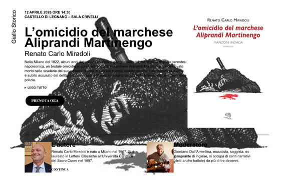 12/04/26 Legnano - Renato Carlo Miradoli presenta “L'omicidio del marchese Aliprandi Martinengo”. https://lastoriatralerighe.fondazionepalio.org/eventi/lomicidio-del-marchese-aliprandi-martinengo/