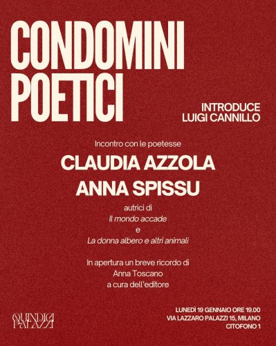 Incontro con le poetesse Claudia Azzola e Anna Spissu, autrici di "Il mondo accade" e "La donna albero e altri animali", in occasione del primo incontro del ciclo di eventi "Condomini poetici". Introduce Luigi Cannillo.