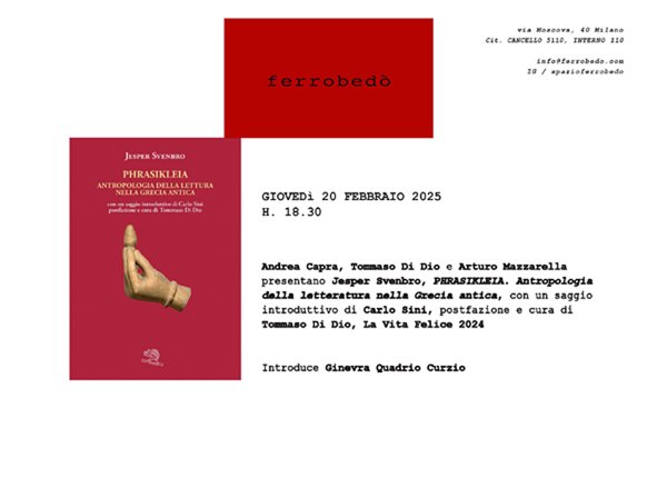 giovedì 20 febbraio 2025 - h. 18.30 - Ferrobedò - via Moscova, 40 Milano - cit. cancello 5110, interno 110 - presentazione del libro di Jesper Svenbro, PHRASIKLEIA