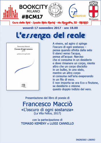 Nell'ambito di BOOKCITY MILANO 2017, presentazione de "L'oscuro di ogni sostanza" di Francesco Macciò. Relatori Tomaso Kemeny e Luigi Cannillo.