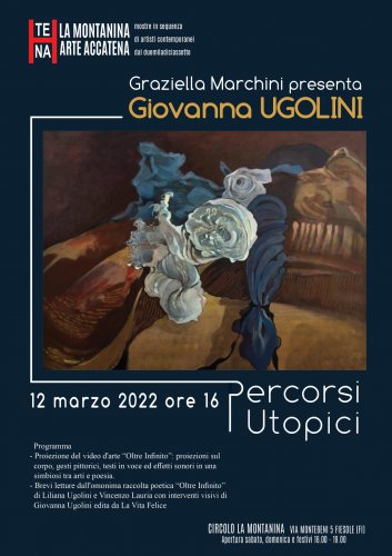 Sabato 12 Marzo alle ore 16 riprenderà la rassegna Arte Accatena (ideata da Piero Forosetti ) alla Casa del Popolo La Montanina di Montebeni con la mostra "Percorsi Utopici" di Giovanna Ugolini. Dopo la presentazione della mostra, a cura di Graziella Marchini, ci sarà anche uno spazio dedicato alla raccolta poetica "Oltre Infinito" di Liliana Ugolini e Vincenzo Lauria con opere visive di Giovanna Ugolini. Verrà proiettato il video d'arte omonimo, all'interno del quale sarà possibile riascoltare la voce e i testi di Liliana in simbiosi con l'arte visiva di Giovanna. Infine ci sarà uno spazio per alcune letture dal vivo.