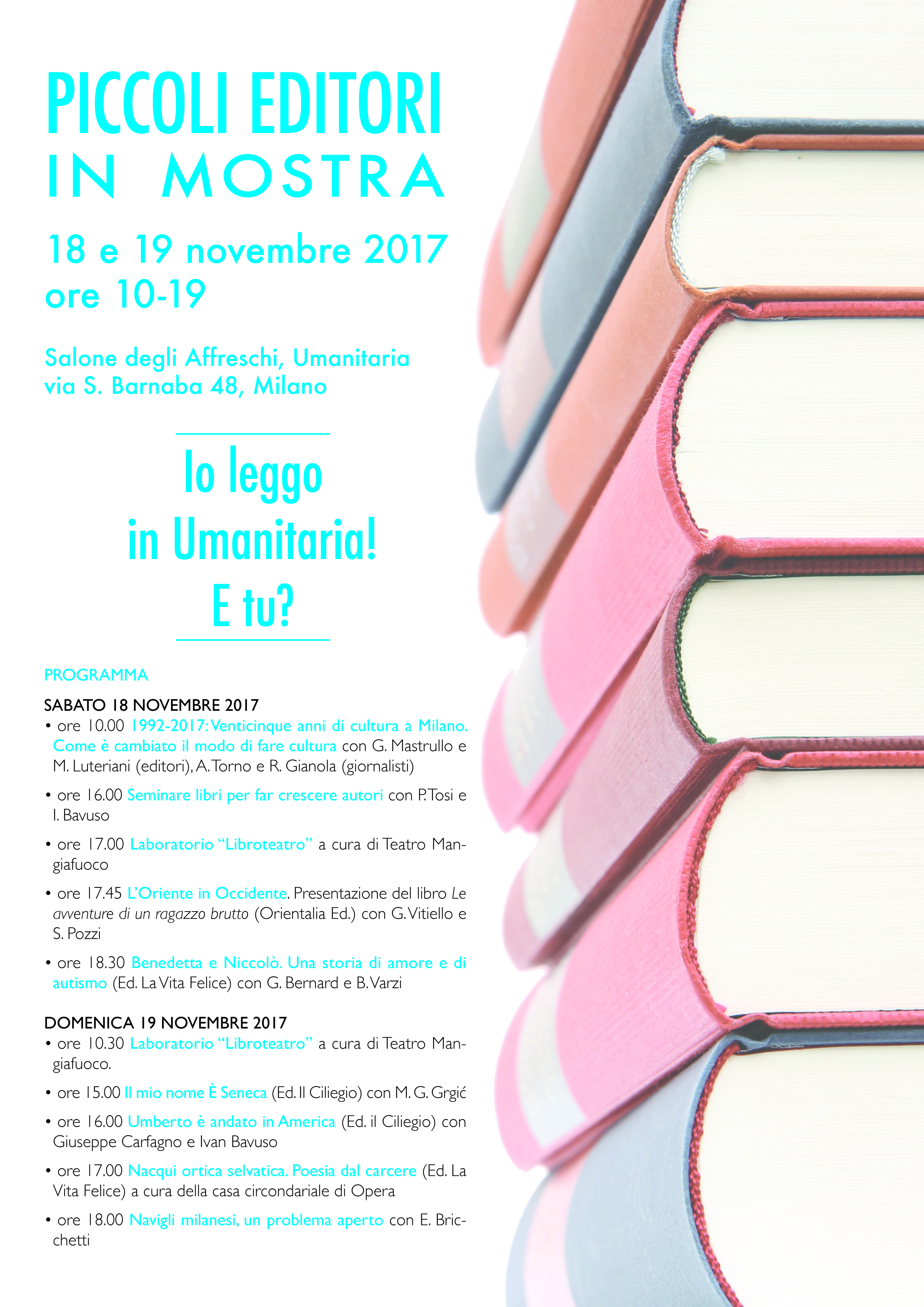 Presentando l’iniziativa "Piccoli editori in mostra" viene subito da chiedersi se serve davvero una nuova fiera del libro, peraltro di piccoli editori. Ovviamente la risposta è sì ed è per questo che la Società Umanitaria ha deciso di organizzare, nei giorni 18 e 19 novembre 2017, all’interno della manifestazione “Bookcity”, una mostra-mercato riservata ai piccoli editori.