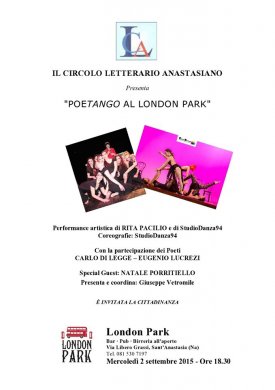Sempre impegnato a creare nuove opportunità culturali sul territorio, il Circolo Letterario Anastasiano di Giuseppe Vetromile ha in calendario un interessante evento artistico-letterario per il prossimo 2 settembre. Si svolgerà infatti nell’accogliente parco del Bar Birreria “London Park” di Via Grassi a Sant’Anastasia (Na), lo spettacolo “Poetango al London Park“, con in programma le performances artistiche di Rita Pacilio e di StudioDanza94, con le coreografie di StudioDanza94 di Carmen Pepe e la partecipazione dei poeti Natale Porritiello, Carlo Di Legge ed Eugenio Lucrezi. Il coordinamento e le presentazioni saranno a cura di Giuseppe Vetromile, organizzatore dell’evento.