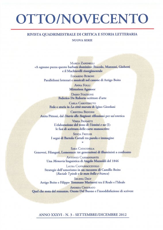 «A ognuno puzza questo barbaro dominio»: Foscolo, Manzoni, Gioberti e il Macchiavelli risorgimentale Edoardo Buroni Parallelismi lettterari e musicali nel canone di Arrigo Boito Anna Folli Misteriosa Aganoor Dario Stazzone Federico De Roberto scrittore d'arte Carla Carotenuto Fede e storia in La città murata di Igino Giordani Cristina Benussi Anita Pittoni, dal Diario alle Stagioni: riflessioni per un'estetica Virga Brigatti L'elaborazione del testo di Uomini e no (I): le fasi di scrittura delle carte manoscritte Silvia Freiles I segni di Bartolo Cattafi tra parola e immagine *** Sara Cataudella Genovesi, Filangeri, Lomonaco: tre generazioni di illuministi a confronto Antonio Carrannante Una Memroia linguistica di Angelo Mazzoldi del 1846 Laura Cannavacciuolo Strategie dell'umorismo in un racconto di Camillo Boito (Baciale ’l piede e la man bella e bianca) Selena Daly Arrigo Boito e Filippo Tommaso marinetti tra il Reale e l'Ideale Andrea Chiurato Quel che resta del romanzo. Oreste Del Buono e l’insoddisfazione di scrivere |