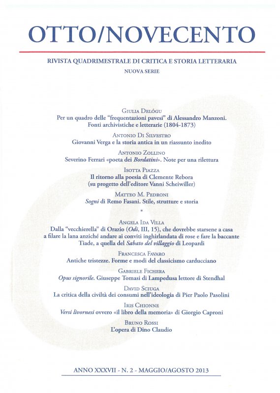 Per un quadro delle “frequentazioni pavesi” di Alessandro Manzoni. Fonti archivistiche e letterarie (1804-1873) Antonio Di Silvestro Giovanni Verga e la storia antica in un riassunto inedito Antonio Zollino Severino Ferrari «poeta dei Bordatini». Note per una rilettura Isotta Piazza Il ritorno alla poesia di Clemente Rebora (su progetto dell'editore Vanni Scheiwiller) Matteo M. Pedroni Sogni di Remo Fasani. Stile, strutture e storia *** Angela Ida Villa Dalla “vecchierella” di Orazio (Odi, III, 15), che dovrebbe starsene a casa a filare la lana anziché andare ai conviti inghirlandata di rose e fare la baccante Tiade, a quella del Sabato del villaggio di Leopardi Francesca Favaro Antiche tristezze. Forme e modi del classicismo carducciano Gabriele Fichera Opus signorile. Giuseppe Tomasi di Lampedura lettore di Stendhal David Sciuga La critica della civiltà dei consumi nell'ideologia di Pier Paolo Pasolini Iris Chionne Versi livornesi ovvero «il libro della memoria» di Giorgio Caproni Bruno Rossi L'opera di Dino Claudio |